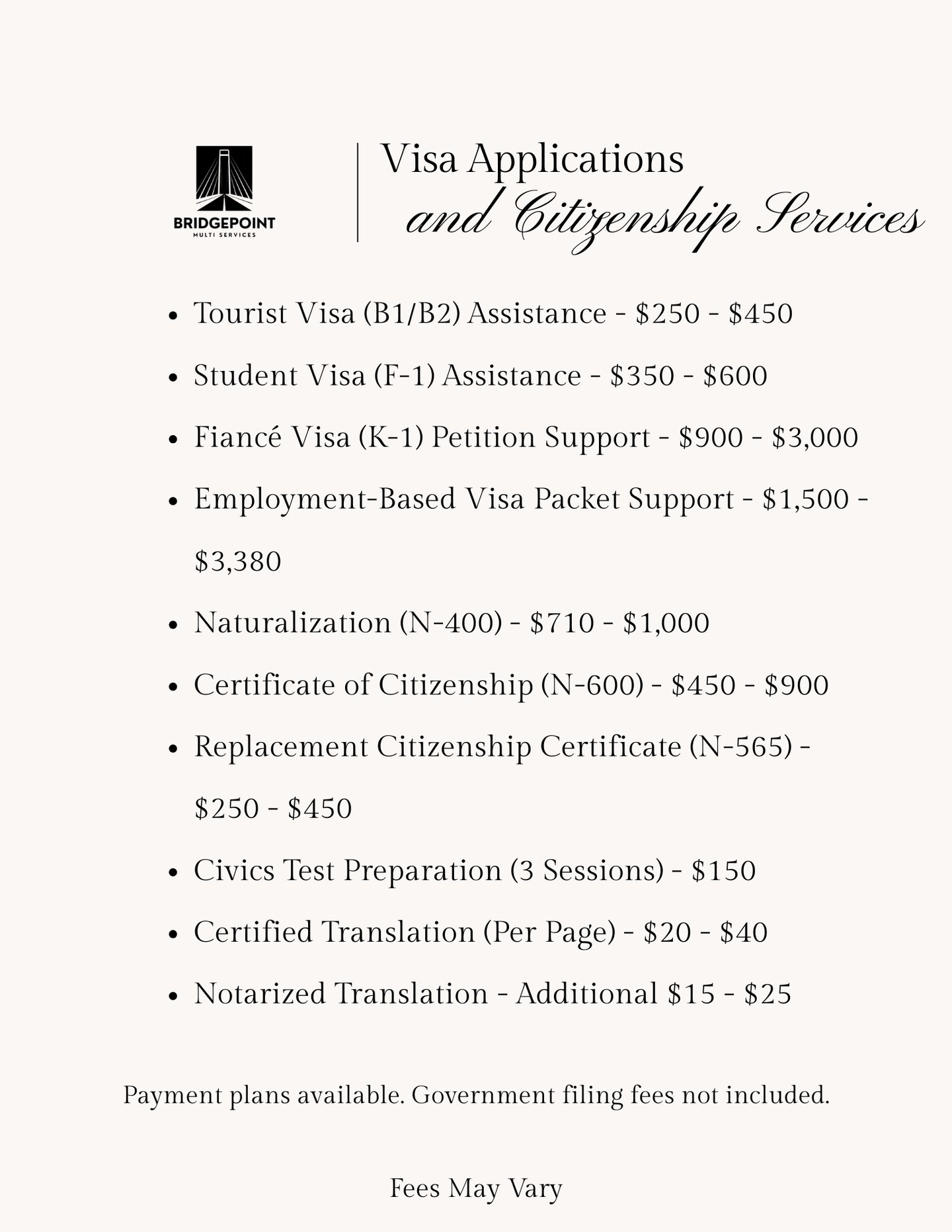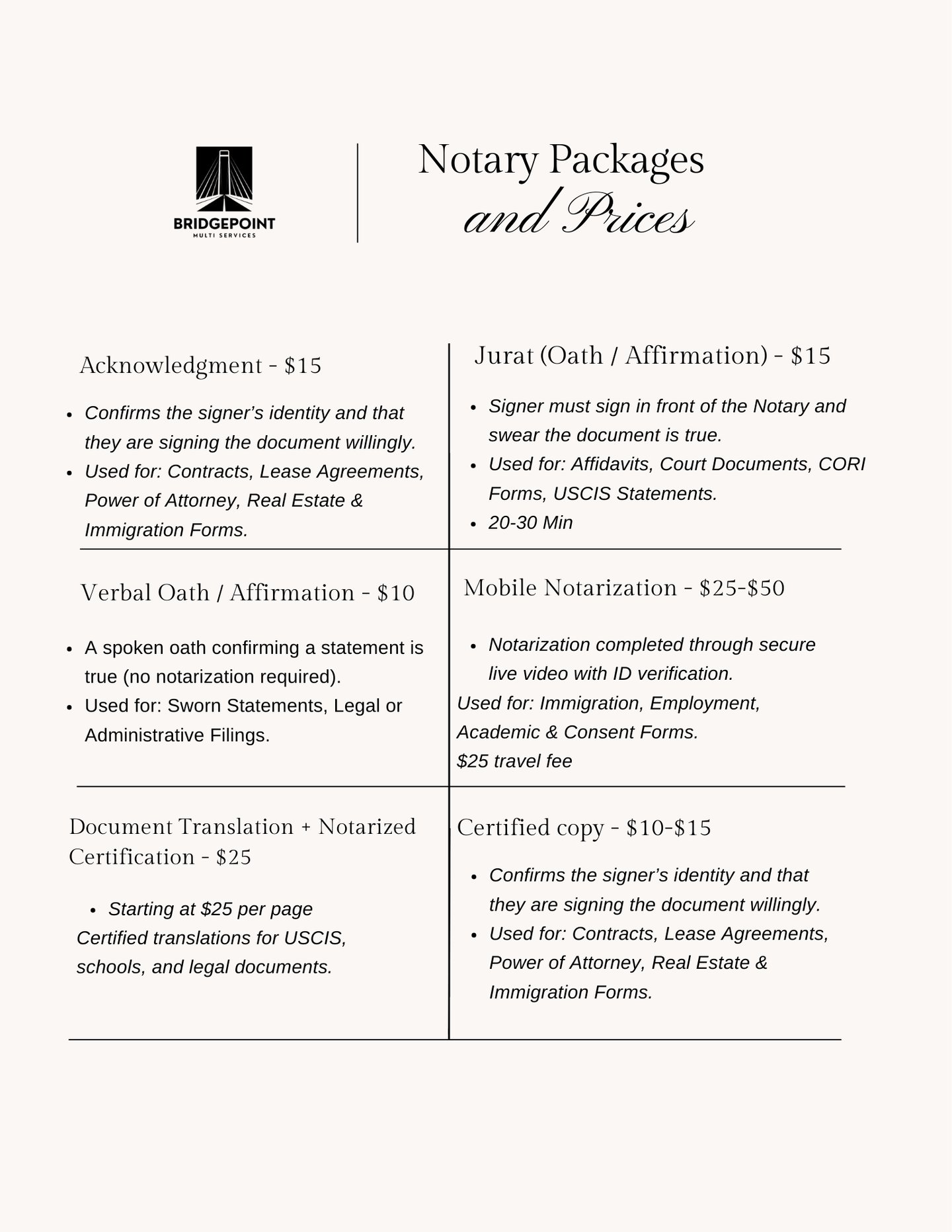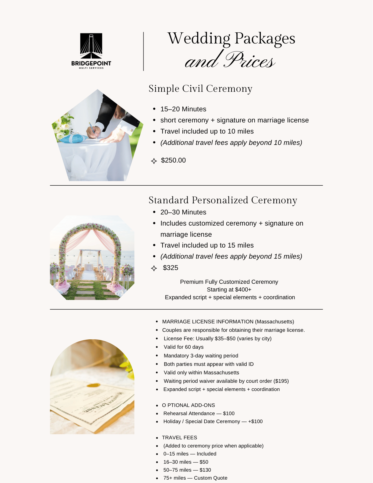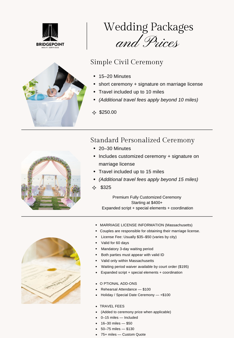 Bridgepoint Multi Service made my wedding officiant experience seamless and memorable. Their professionalism and attention to detail were outstanding. Highly recommend their services!
